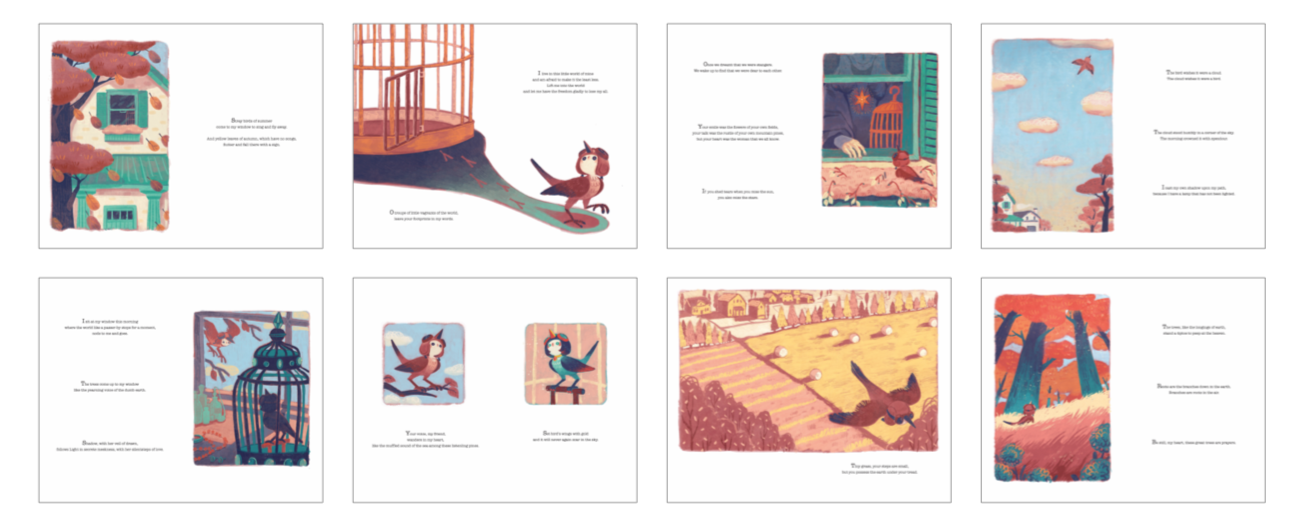 This is a picture book adaptation of Rabindranath Tagore’s beloved Stray Birds poetry collection. Thirty-five poems are selected and rearranged by theme, each is paired with original illustrations that capture their mood. A small bird character threads these images into a continuous journey—one that begins with its release from a cage and unfolds into a quiet exploration of freedom, love, and mortality.